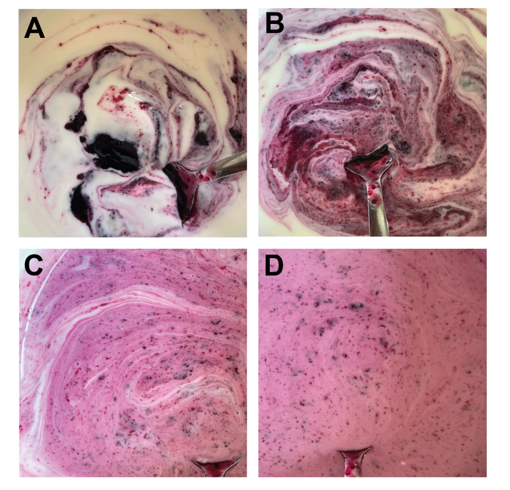 So, we have two materials – jam and yogurt – with different colors and viscosity (rheologies) which we mix slowly. The mixing is the tectonic bit – folding, faulting and generally stirring up the rock layers. To start with the two materials are quite distinct, but as we mix fine strings of jam get drawn out and incorporated into the yogurt. These strings are attenuated folds and form what is referred to as tectonic laminations. You might draw out and stretch a lump of chewing gum thinner and thinner until it breaks. The same is true of the jam, the spoon folds it over and as you mix the fold is stretch out till it breaks. The more you mix (deform) the finer the laminations become. Thicker ‘blobs’ become shaped like sausages (boudins) and form distinct streamlined shapes. In Photo C you can still see some of the folds but they are getting very attenuated. Keep mixing the color begins to become more uniform, the tectonic laminations become so fine you can barely see them. In time you get a complete uniform mix of the two materials. When mixing sediments we refer to this as diamicton, a sediment with a mix of grain sizes and properties.